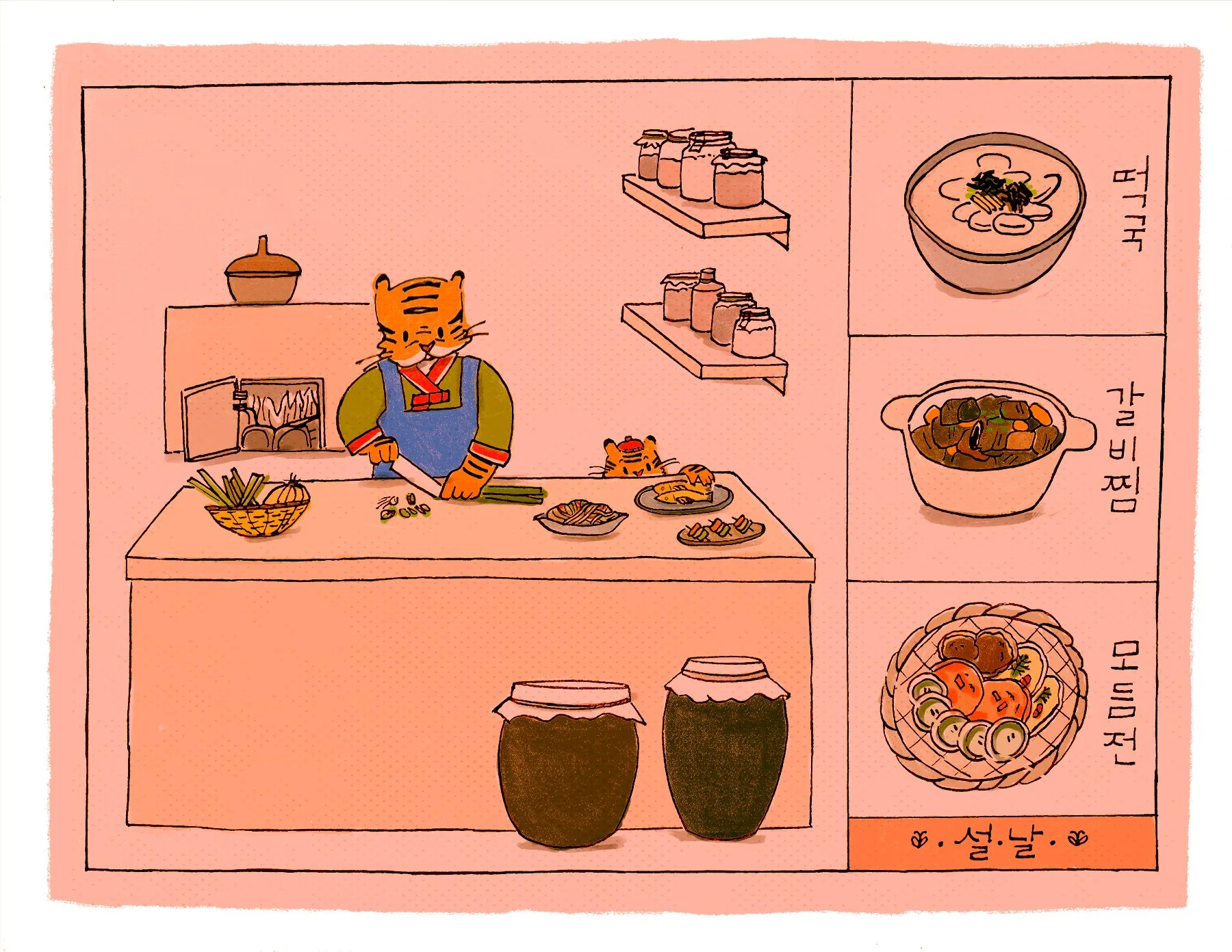 I knew I wanted to draw something for the lunar new year, but it initially started as an entirely different drawing. As I was taking a break to think about how to do the background, I started drawing some Korean dishes. I thought about the chaos and fun of family gatherings and our moms preparing the meals. Thinking about how this year is the Year of the Tiger, this character popped into my head: the tiger mom (lol). What would she be doing? Who else would be with her? I loosely and quickly sketched something out in the bottom corner. And that became the premise for the piece I’m sharing today.