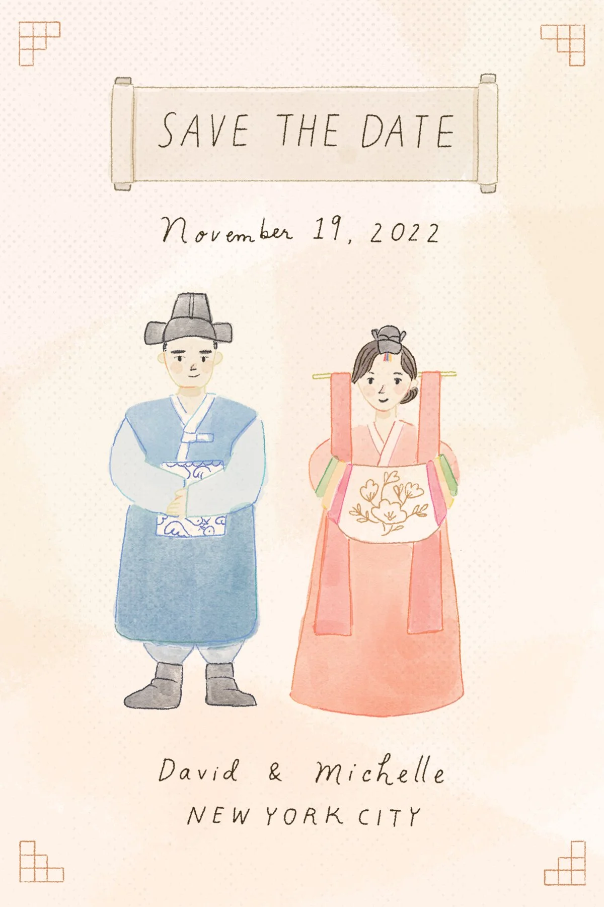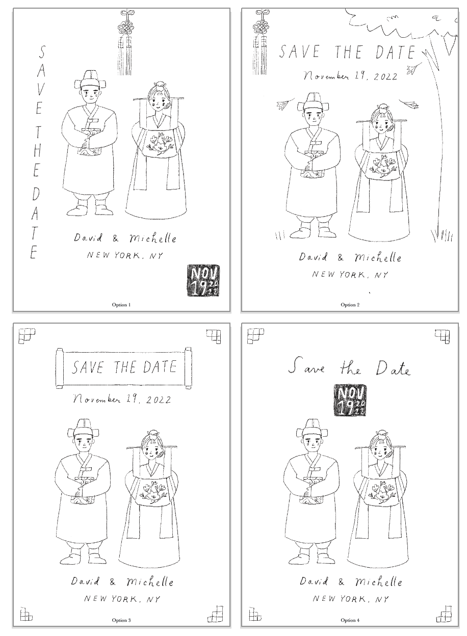 This past month, I was fortunate enough to do another commission piece for a lovely couple out in New York. We were connected through a mutual friend, and she gave me a helpful mood board of what she was looking for: something involving paebaek (a Korean wedding custom), a scroll, the date in a seal/stamp style, soft color palette, and other design elements. After showing her a few different b&w sketches in the first round, she went with Option 3 which I then colored for the final piece.